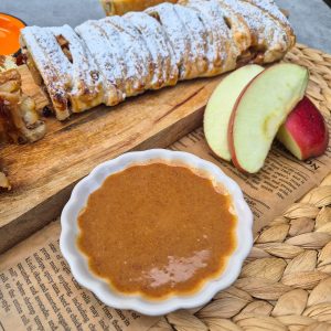 Appelstrudel, een traditioneel gebakje uit het voormalige Oostenrijk-Hongarije. Het word van Origine met echt deeg gemaakt, maar ik kies voor de simpele manier en gebruik een rol bladerdeeg. Het recept is voor een goed gevulde knapperige rol bladerdeeg gevuld met appel en rozijnen. En ipv de traditionele vanillesaus heb ik gekozen voor een zoete pindakaassaus. Met maar 3 ingrediënten maak je van iets hartigs iets zoets maar blijf je ook het hartige van de pindakaas proeven. Samen met de appelstrudel is dit gewoon een perfecte combinatie. Lees snel verder voor het recept