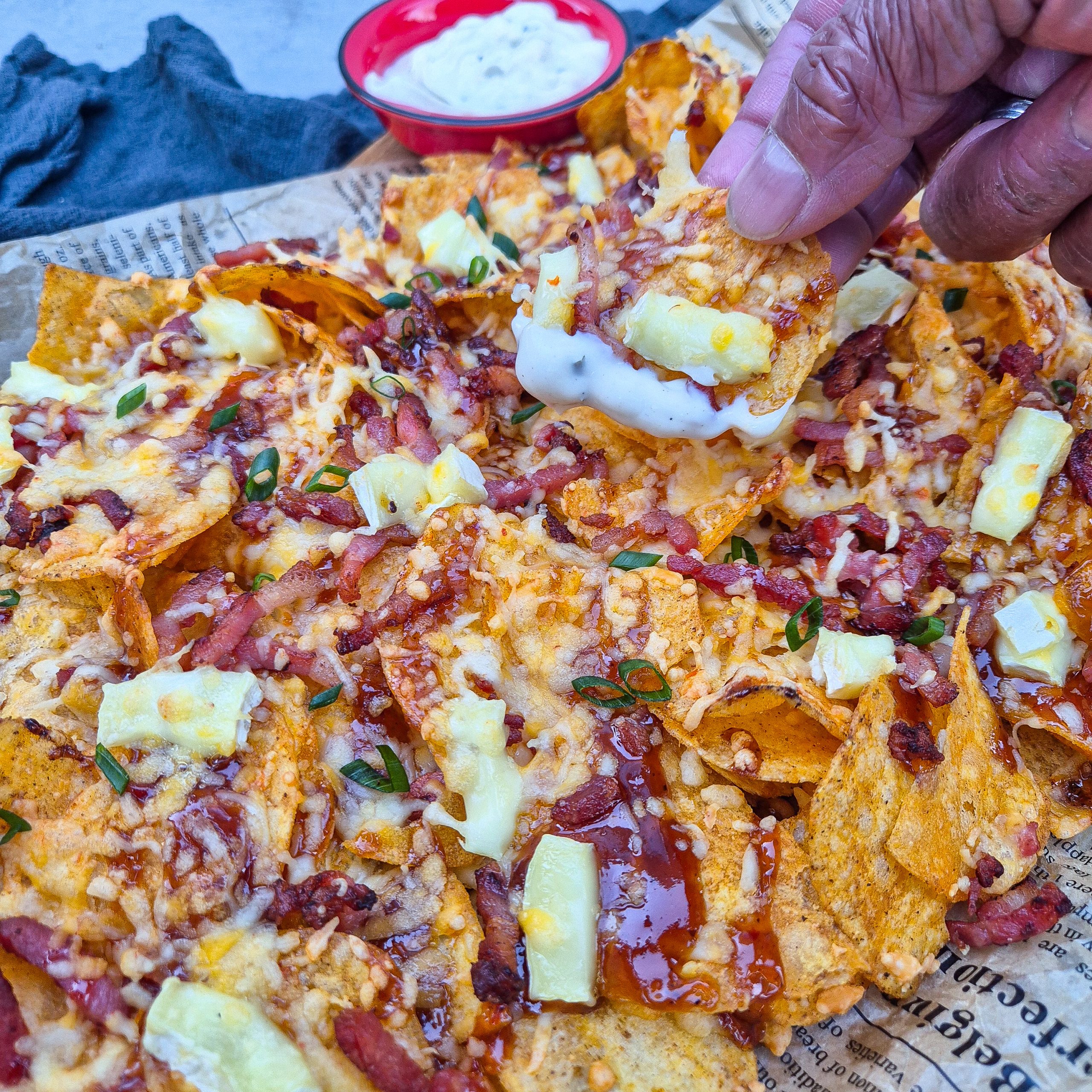 - Verdeel 2/3 van de kaas over de chips gevolgd door de bbq saus
