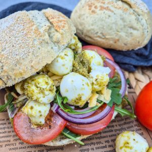 - Verdeel de mozzarella balletjes over de broodjes en zet de bovenkant van het broodje erop en geniet ervan