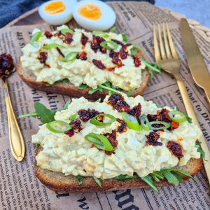 7. Beleg de boterhammen met rucola, verdeel de eiersalade erover en serveer met chrispy chili olie