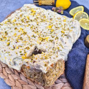 - Wanneer de cake volledig is afgekoeld, smeer je de roomkaas glazuur erop. Maak af met de citroen rasp en de fijn gehakte pistache nootjes