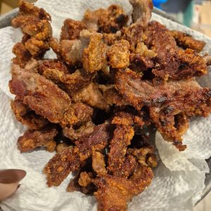 - Verhit een pan op het vuur en doe hier een laagje olie in. Als de olie warm is dan bak je in (porties) het vlees tot het knapperig is. +- 5 minuten. Herhaal dit tot al het vlees krokant gebakken is en zet even apart
