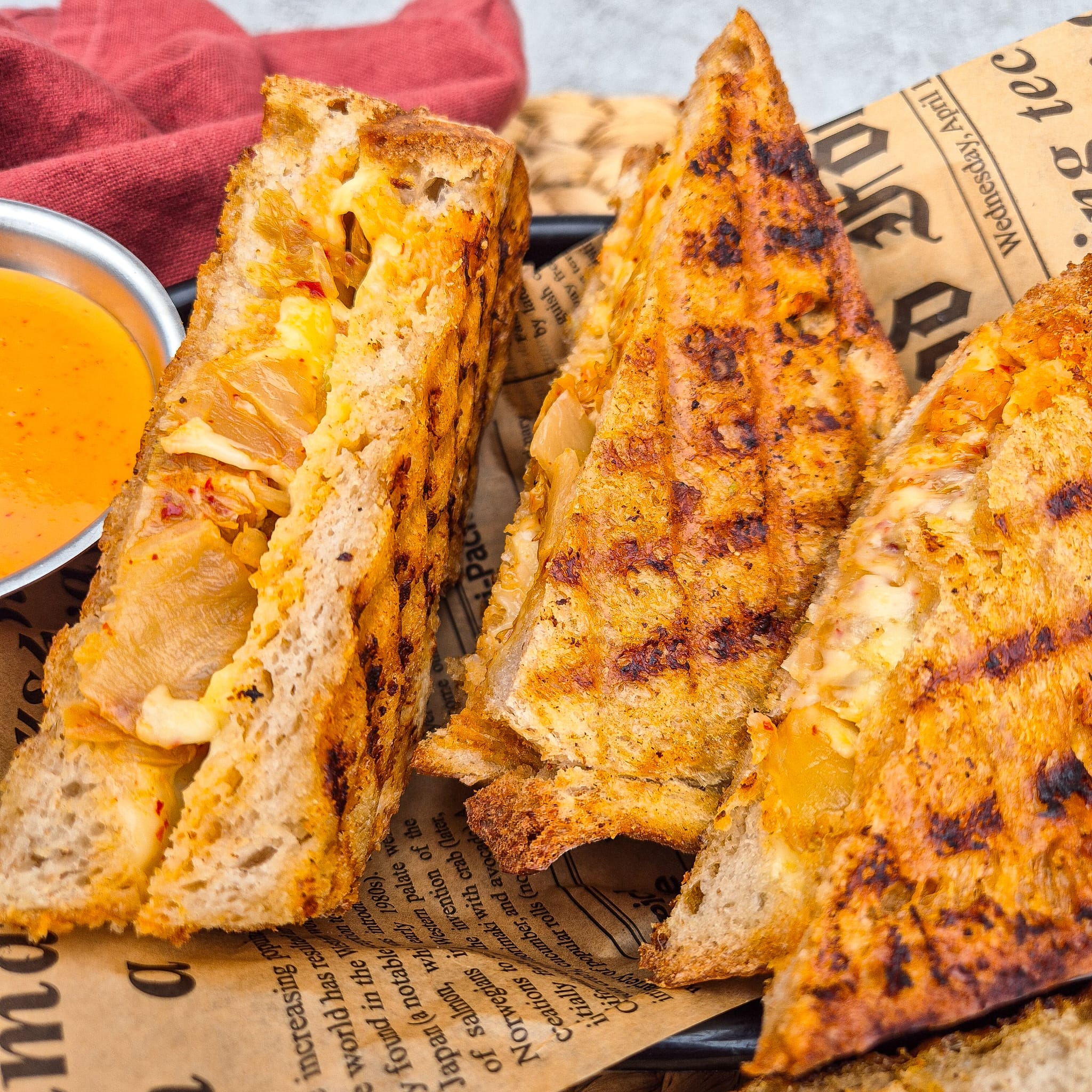 - Beleg 1 kant van het brood met wat kaas en verdeel hier de kimchi over gevolgd door de overgebleven kaas