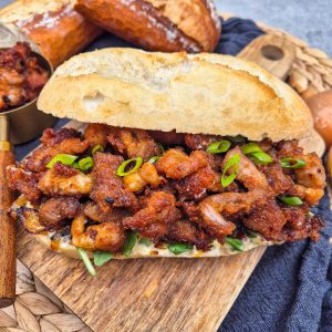 Dit broodje hoort zonder twijfel bij mijn favorieten. Een vers broodje met zacht gebakken ui en een heerlijke honing-mosterdsaus die meteen zorgt voor een volle, lichtzoete kick. Daarbovenop liggen stukjes krokant gebakken schouderkarbonade: goudbruin, knapperig en heerlijk sappig. Simpel om te maken, maar zó lekker dat je ’m keer op keer wilt eten. Een absolute topper onder de broodjes!