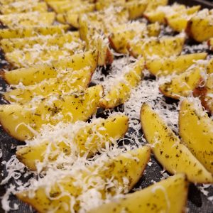 - Leg de aardappelpartjes op de bakplaat met de schil naar beneden. Strooi er nog wat Parmezaanse kaas overheen.