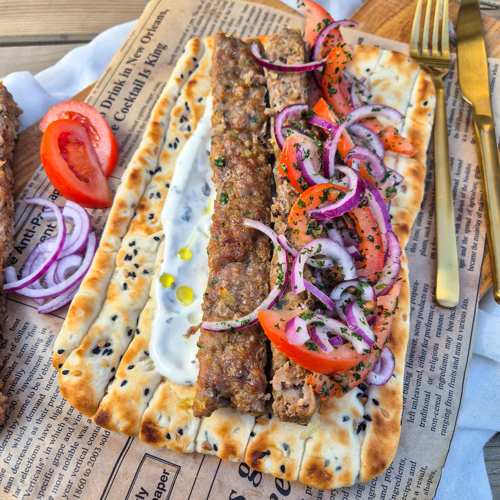- Haal de kebab uit de oven en serveer de stroken in de warme Perzische flatbreads met de frisse tomatengarnering.