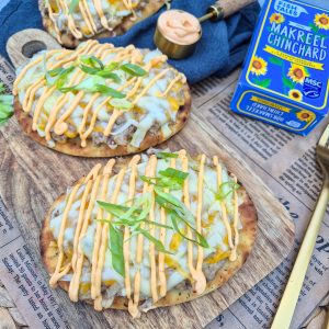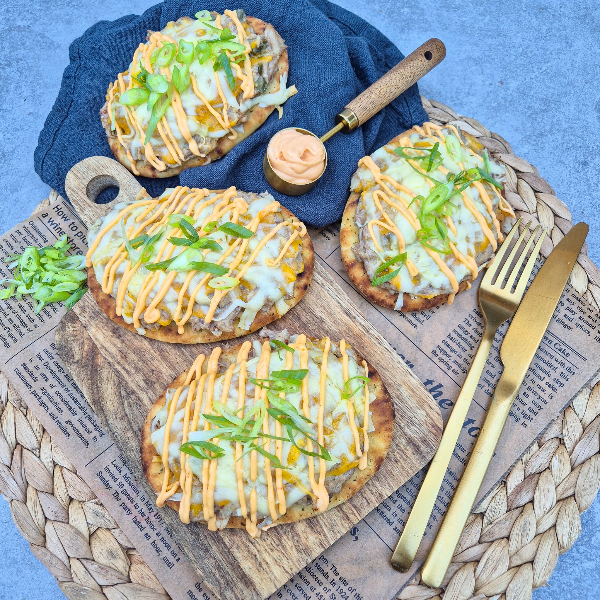 - Verdeel de makreelsalade over de 4 naan broden en beleg rijkelijk met de kaas