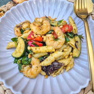 Pasta pesto salade met garnalen, heerlijke malse garnalen met knapperig gebakken groenten in een romige pesto saus. Geserveerd met pasta naar keuze heb je een heerlijke maaltijd voor de warme dagen. Je kan de salade lauw warm eten maar koud is het ook een smaakbommetje. Serveer eventueel met een stukje brood naar keuze. Lees snel verder hoe je deze salade maakt.