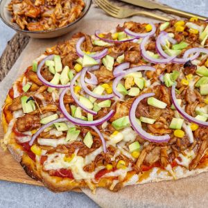 - Als de Pinsa klaar is beleg je hem met de BBQ kip, avocado en de halve uienringen