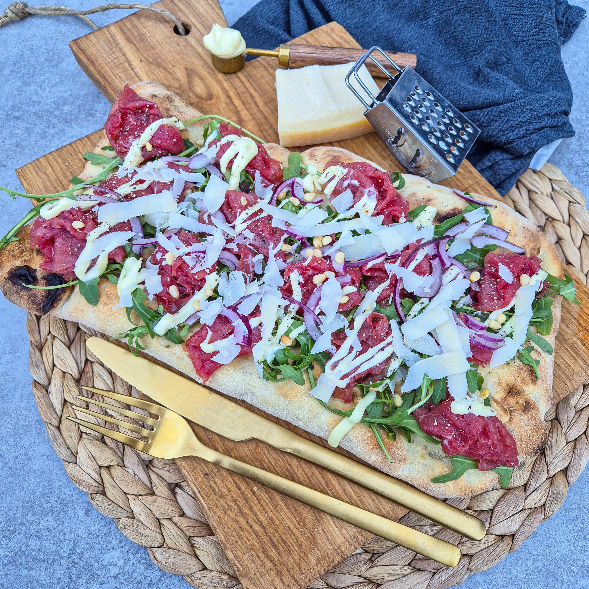 Heb jij al eens een pinsa geprobeerd? Als je deze eenmaal geproefd hebt dan ben je verkocht. Ik gebruik voor dit recept de pinsa van Bella Italia. Door de honinggraat heeft de pinsa een lichte en knapperige textuur en belegd met carpaccio is het misschien wel lekkerder dan een broodje carpaccio. (ja dat durf ik te zeggen). Ben je nu nieuwsgierig geworden naar de pinsa carpaccio? Lees dan snel verder voor het recept