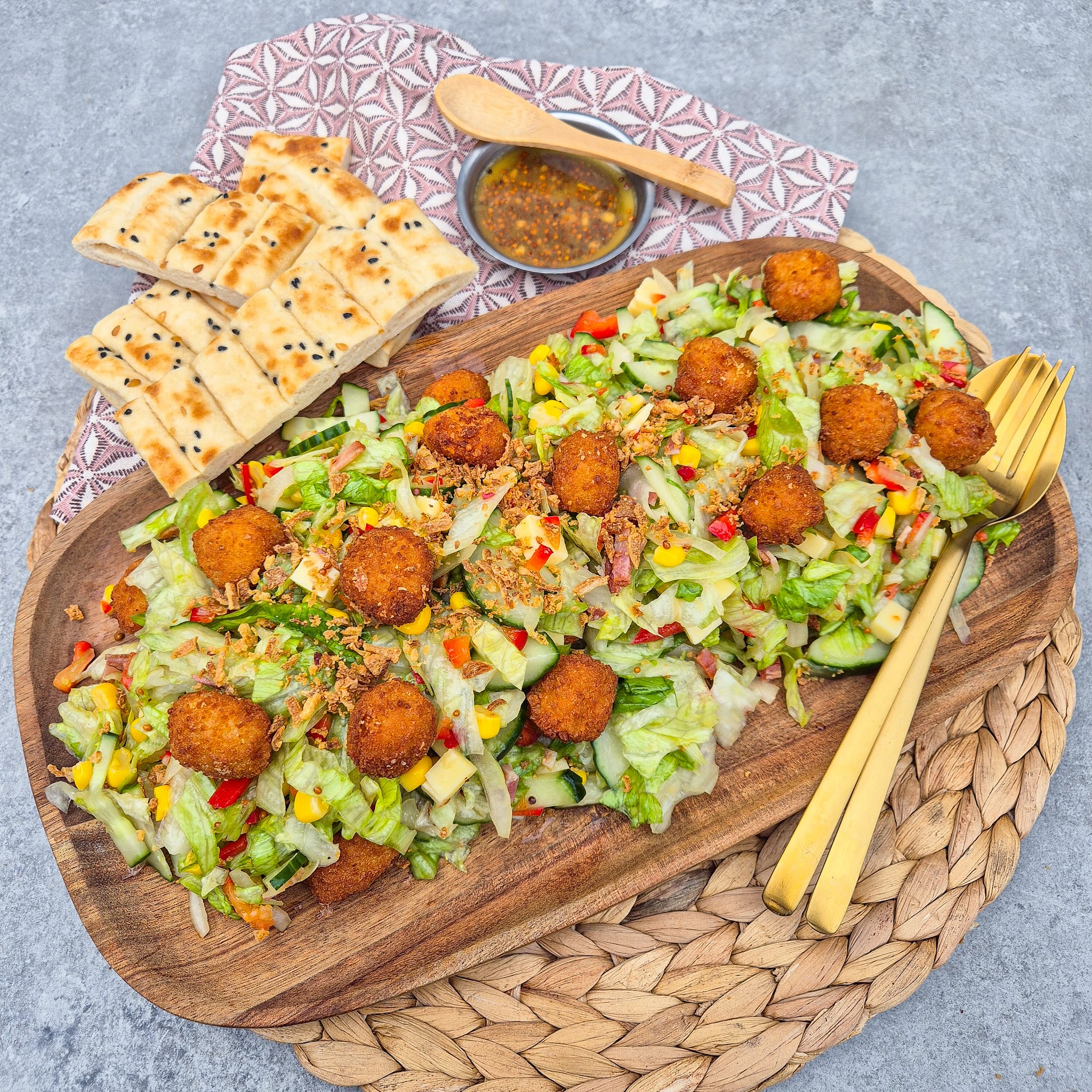 6. Bereid nu de popcorn kip zoals beschreven staat op de verpakking en voeg ze toe aan de salade