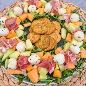 Salade met rauwe ham, meloen en gemarineerde mozzarella bolletjes