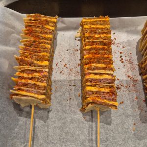 - Bestrooi de spiesen nog met een beetje rub en leg ze op een met bakpapier beklede bakplaat.