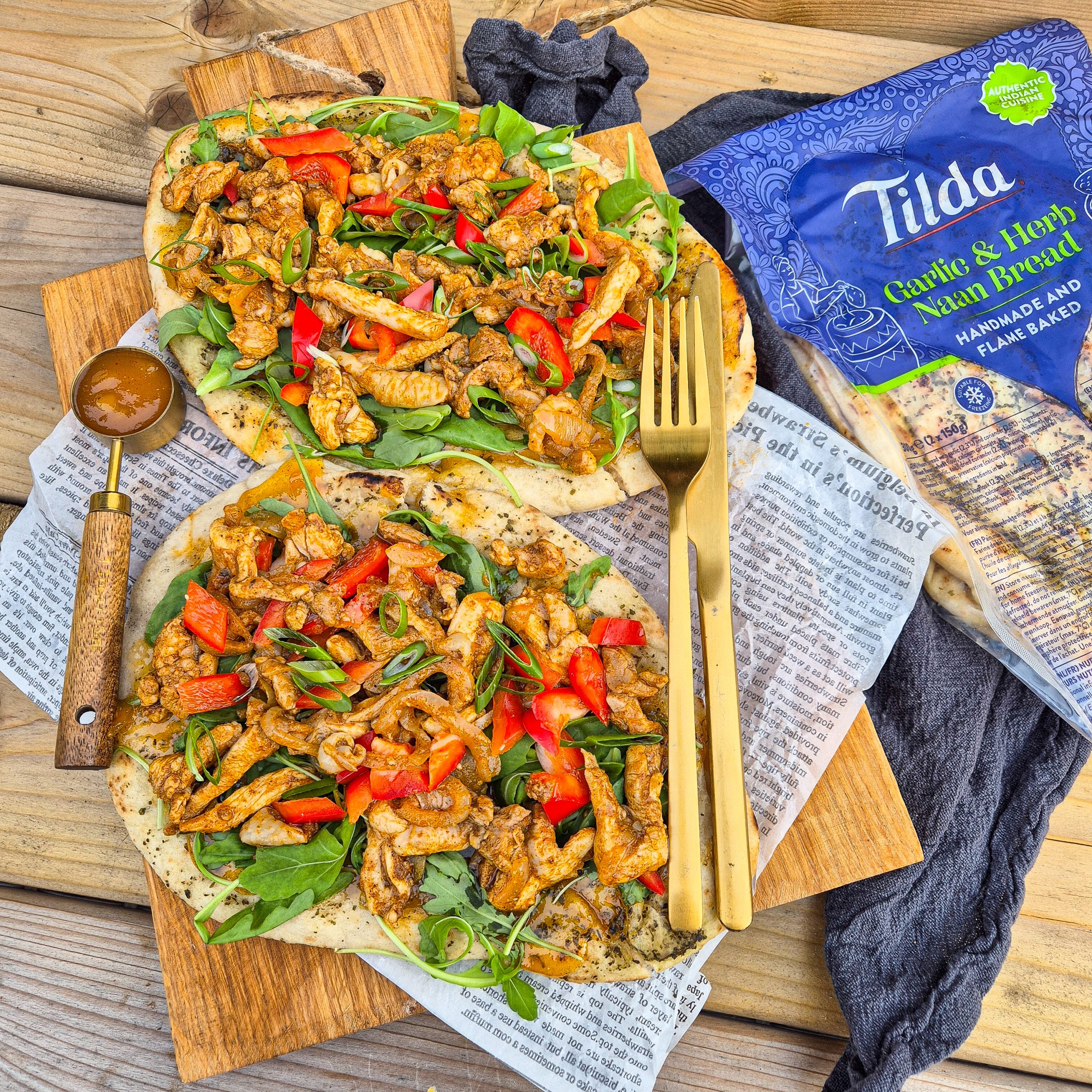 Besmeer beide naan broden met de mango chutney en schuif voor 5 minuten in de oven