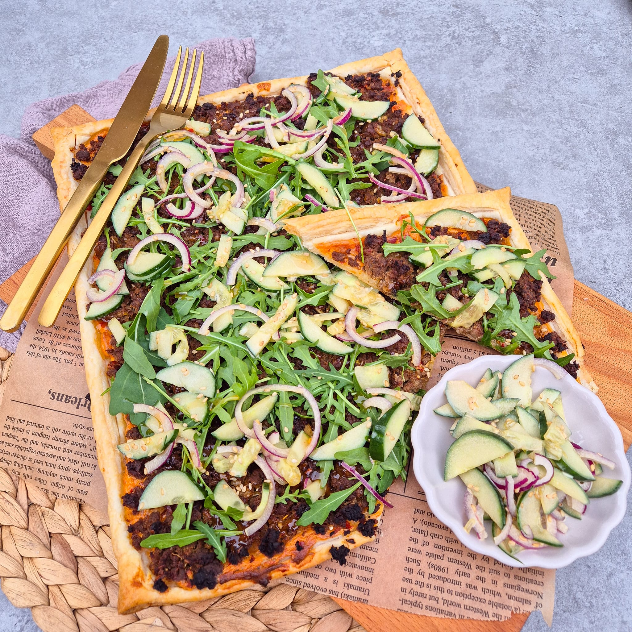 Haal de plaattaart uit de oven en verdeel er wat sriracha over, gevolgd door de rucola en de komkommer salade