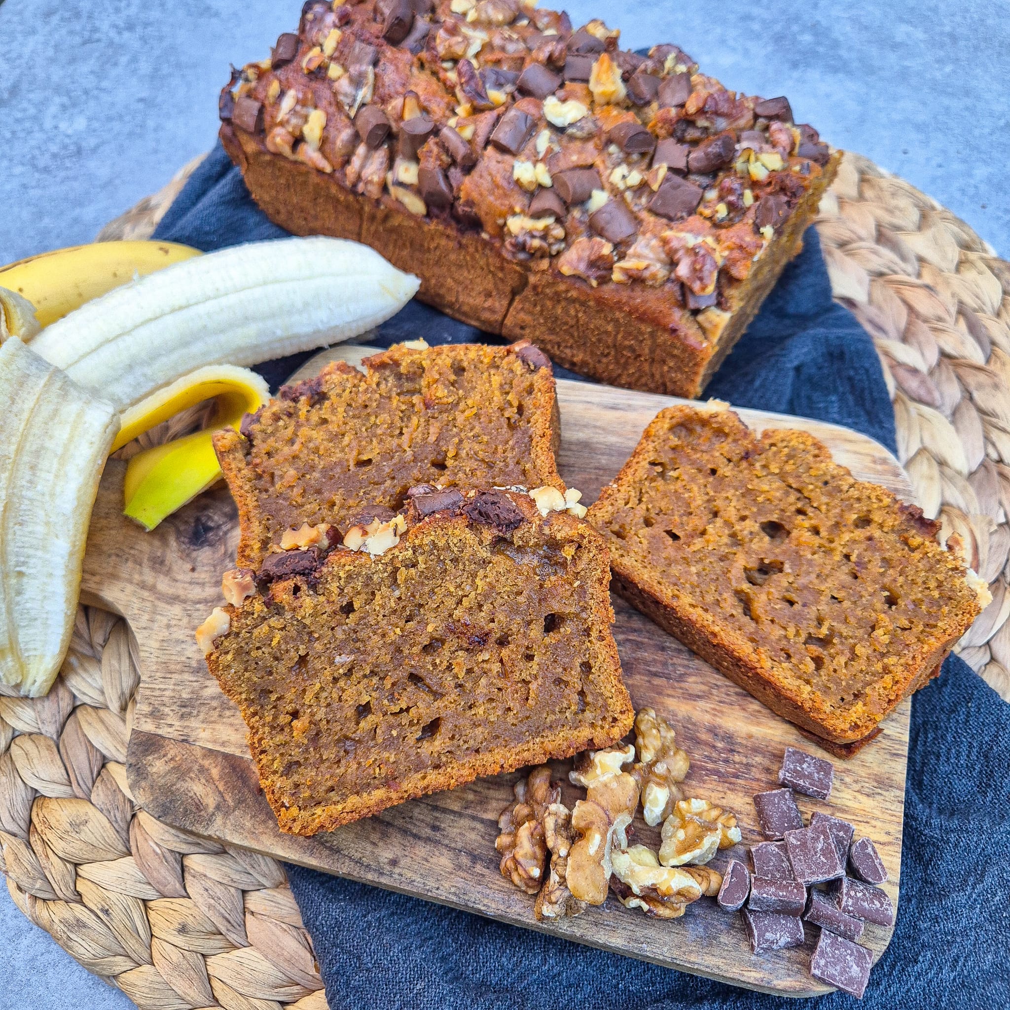 - Schenk de pompoen erbij samen met de geprakte banaan en de vanille extract en meng dit goed door elkaar